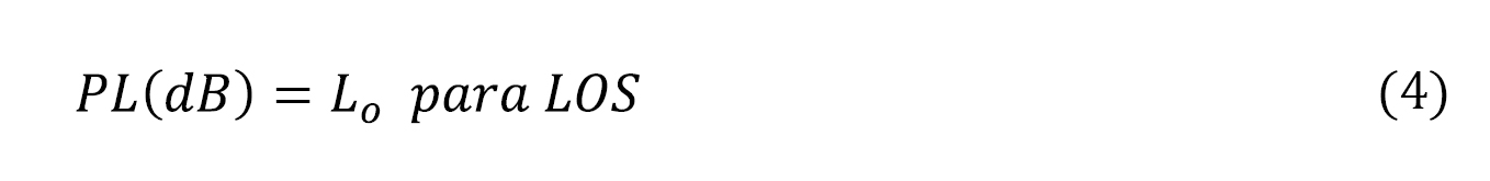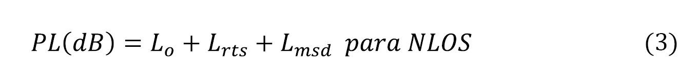 El modelo Walfisch-Ikegami se desarrolló a partir de una descripción estadística precisa de un entorno urbano [15]. Es válido con alturas de la EM de entre 1 m y 3 m y de la antena de EB entre 4 m y 50 m de altura [16]. Además, se considera para un rango de de 800 MHz a 2000 MHz. Walfisch-Ikegami contempla enlaces NLOS y con línea de vista (LOS). En (3) y (4) se presentan las ecuaciones que definen este modelo: