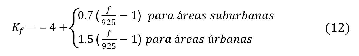 Siendo f la frecuencia expresada en MHz, d la distancia del transmisor al receptor dada en Kms, hb es la altura de la antena de EB en metros, y ahm es un factor de corrección de la antena de la Estación Móvil (EM), que depende de la densidad de las estructuras en el entorno urbano, caso en el cual se calcula mediante (2):
