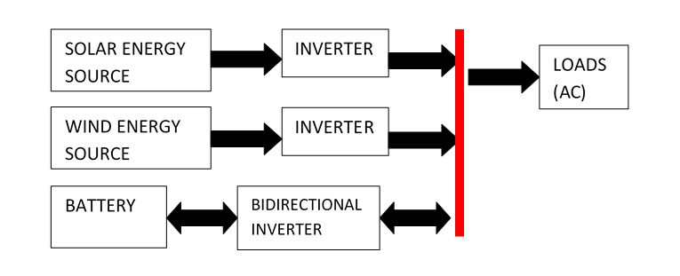 Parallel topology with AC coupling [7]: This topology requires a dynamic control that takes into account the control of the voltage and frequency of the network, its stability, and its protection. In addition, each renewable generation source requires an inverter to match its voltage and frequency. This inverter must guarantee proper timing (Fig. 1).
