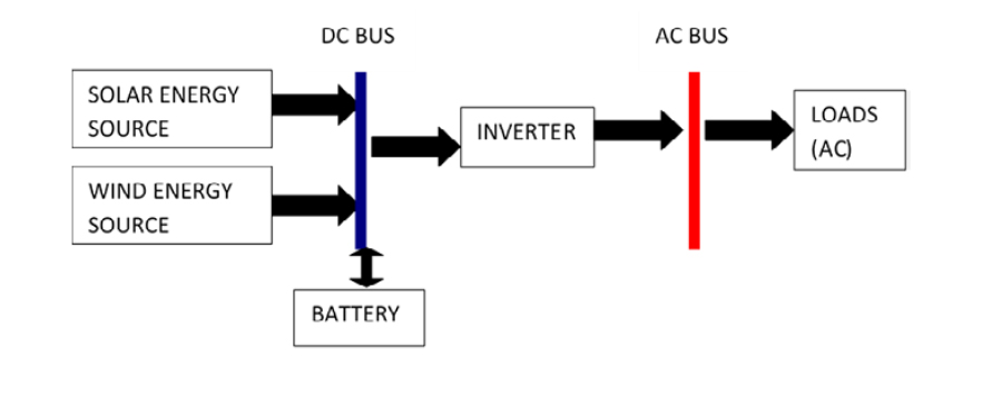 Serial topology [7]: In this configuration, the renewable energy sources are connected in series to the DC bus. The power delivered to the battery can be controlled by incorporating a charge regulator in the power sources. The design is relatively simple to implement, but this system has the following disadvantage: low efficiency of the whole system due to the series configuration of the elements; a certain amount of energy is lost due to the low efficiency of the battery and the inverter.
