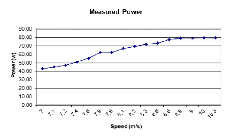 According to the graph presented in Fig. 6, the average speed remained around 8 m/s, during the hours of the test. During this time, the power delivered by the wind turbine was between 45 w and 80 w.