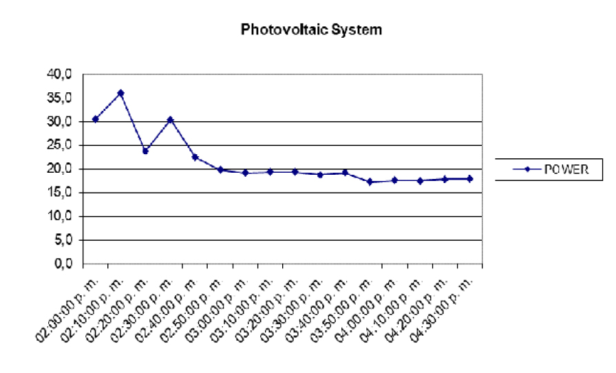 Analyzing the results presented in Fig. 7, the photovoltaic system had a higher power delivery for the first hours of measurement (between 2:00 pm and 3:00 pm). In the afternoon hours, its power decreased around 20 w.