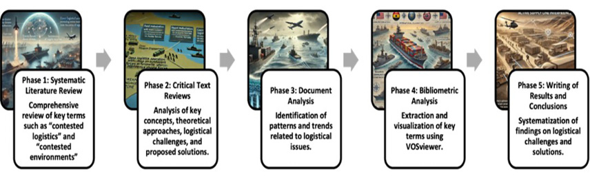 The second phase involved the development of critical reviews for each of the selected texts. In this stage, special attention was given to the following aspects of each document: the concept of contested logistics, the primary theoretical and methodological approach, identified logistical challenges, solutions proposed by the authors, and key elements of premises and conclusions. This process allowed for the extraction of crucial information to understand the multidimensional nature of contested logistics in current operational environments.