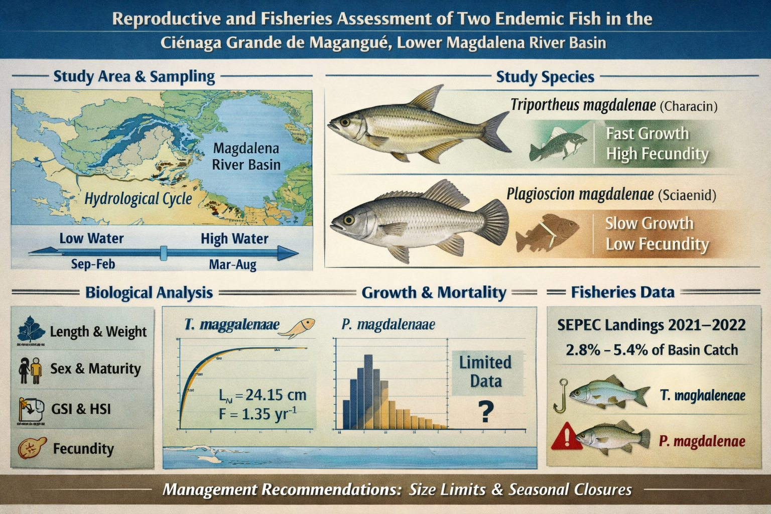 La cuenca del río Magdalena alberga una de las pesquerías continentales más importantes del norte de Sudamérica, pero la información biológica sobre muchas especies endémicas sigue siendo escasa. Este estudio investigó la biología reproductiva, el crecimiento y la explotación del carácido Triportheus magdalenae y del esciénido de agua dulce Plagioscion magdalenae en la Ciénaga Grande de Magangué, un humedal de llanura aluvial neotropical en la cuenca baja del río Magdalena. Se recolectaron muestras mensuales de desembarques artesanales en tres puntos de desembarque durante un año hidrológico (septiembre de 2016 a agosto de 2017), y se analizaron 2210 individuos (1459 de Triportheus magdalenae y 751 de Plagioscion magdalenae). Para cada espécimen, se registraron la longitud total, el peso, el sexo, el estadio de madurez, el índice gonadosomático (IGS), el índice hepatosomático (IHS) y el factor de condición (K). Se estimó la fecundidad de las hembras maduras y se analizaron los datos de frecuencia de longitud con FiSAT II para obtener parámetros de crecimiento y explotación para T. magdalenae y parámetros de crecimiento preliminares para P. magdalenae. Los desembarques a escala de cuenca para 2021-2022 se obtuvieron del Servicio de Estadísticas Pesqueras de Colombia (SEPEC). Ambas especies mostraron picos de desove estacionales distintos asociados con el pulso de inundación (marzo-mayo), pero con estrategias de historia de vida contrastantes. T. magdalenae maduró temprano (hembra L₅₀ ≈ 15,6 cm TL), exhibió una alta fecundidad relativa (~5000 ovocitos por hembra) y un crecimiento rápido (L∞ = 24,15 cm TL; K = 0,60 yr⁻¹). La mortalidad total (Z = 2,68 yr⁻¹) y la mortalidad natural de Pauly (M = 1,33 yr⁻¹) dieron como resultado una mortalidad por pesca F = 1,35 yr⁻¹ y una tasa de explotación E = 0,50, lo que sugiere una explotación cercana al óptimo convencional para muchas poblaciones tropicales. En contraste, P. magdalenae maduró más tarde (hembra L₅₀ ≈ 29,9 cm TL), tuvo menos ovocitos pero de mayor tamaño y tasas de crecimiento más bajas; la mortalidad y la explotación no pudieron estimarse de manera robusta debido a los datos limitados de frecuencia de longitud. Los datos de SEPEC indican que T. magdalenae y P. magdalenae juntas contribuyeron con ~2,8–5,4% del total de capturas de la cuenca en 2021–2022. Nuestros resultados sugieren que T. magdalenae tolera actualmente una presión pesquera moderada, mientras que P. magdalenae parece ser más vulnerable, y respaldan la implementación de límites de tamaño y vedas estacionales que coincidan con los picos reproductivos en las pesquerías de llanuras aluviales neotropicales. Este estudio ilustra un enfoque escalable para evaluar el estado de explotación de peces de agua dulce endémicos en cuencas fluviales tropicales con datos limitados, brindando apoyo empírico a los esfuerzos por conciliar la producción pesquera continental con la conservación de la biodiversidad.