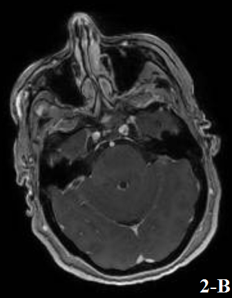 Figure 2. Post-gadolinium enhancement with a nodular pattern found at the level of hypothalamic area (a) and at a periventricular / periependymal level (b).
