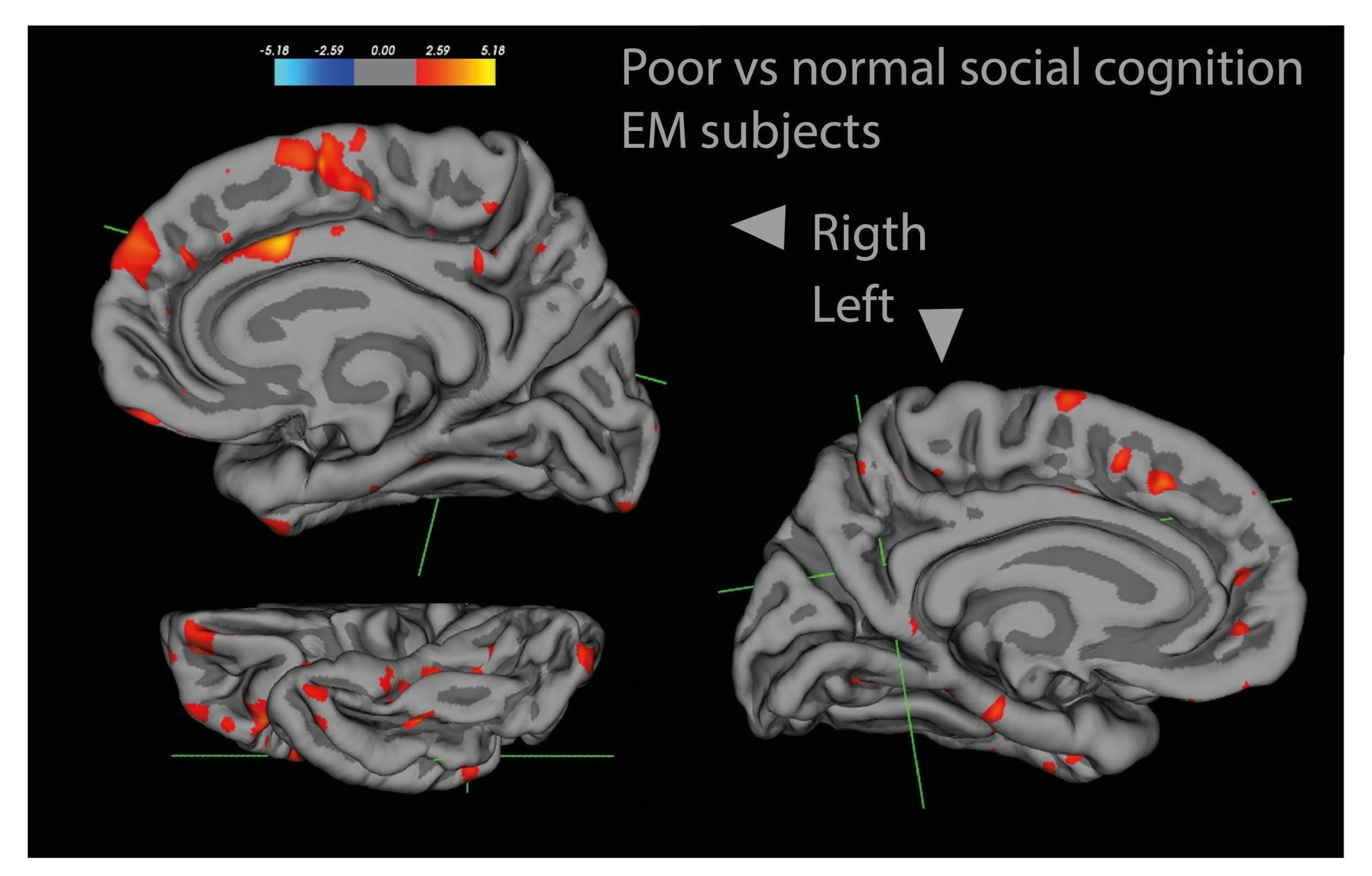 Major differential clusters between patients with normal and impaired social cognition. The magnitude of the differences in standard deviations concerning the regular group is shown in the thermal scale.
