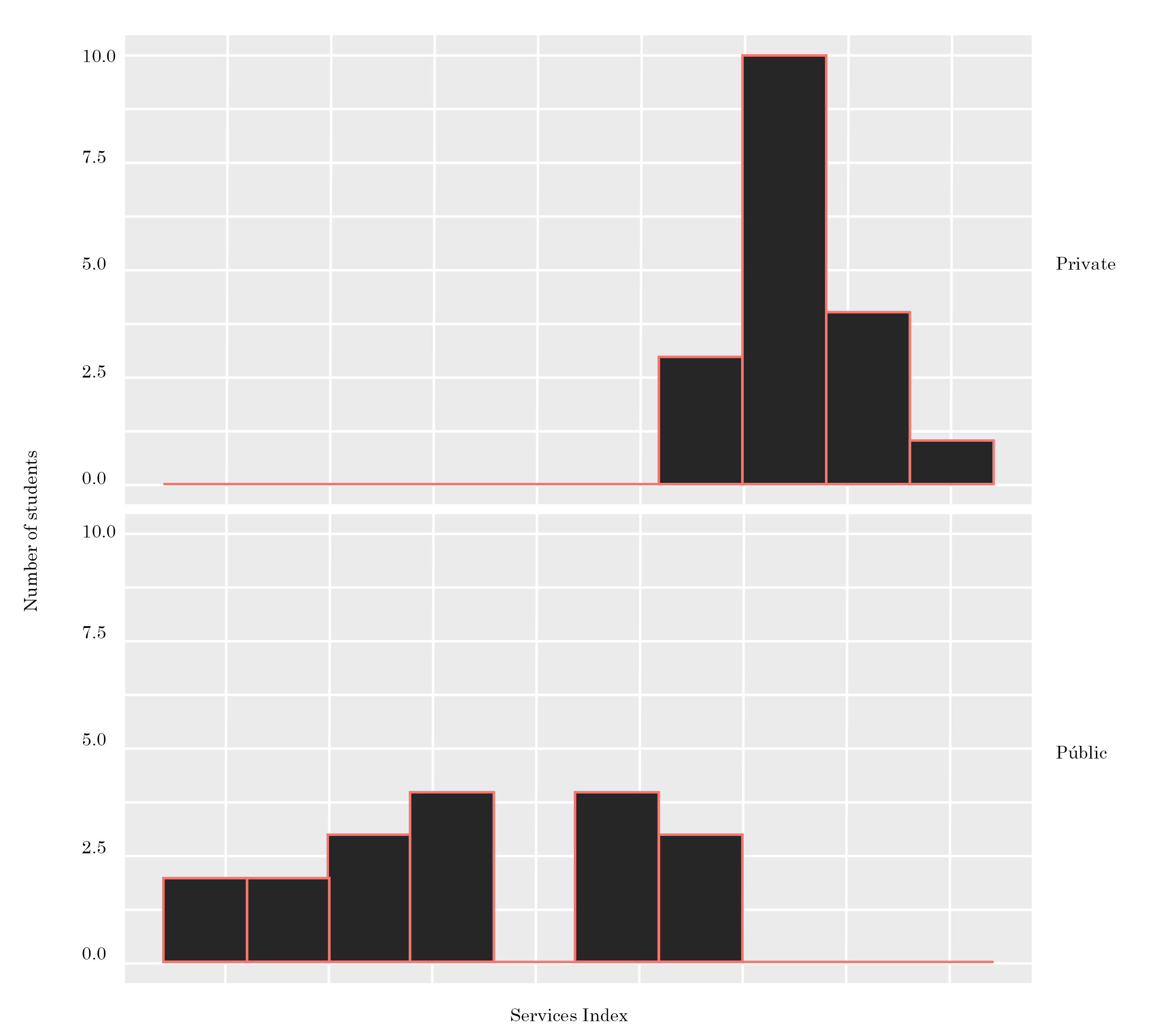 The service index was taken as an indirect indicator of the socioeconomic status of the people participating in the study. The index was constructed between 0 (access to no service consulted) and 1 (access to all services consulted). Figure 1 shows the distribution of the service index by school, which suggests differences in this index across the two schools. As expected, when this indicator was evaluated by means of a statistical analysis, a significant difference was detected in the index of services by type of school (W = 909, p < 0.001), such that participants of the private school had significantly more services (median = .56) than participants in the public school (median = .33).