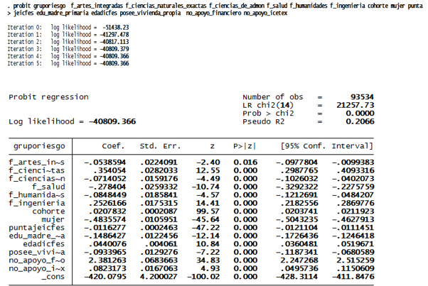 En cuanto a la variable dependiente discreta dicotómica “grupo de riesgo”, toman valores de 1 para las dos Universidades, cuando la clasificación hecha por Spadies para el estudiante se encuentra entre Riesgo Medio y Medio Alto y valores de 0 cuando el grupo se ubica entre Riesgo Bajo y Medio Bajo. Los resultados obtenidos a partir de los modelos probabilísticos se muestran en la Tabla 2.