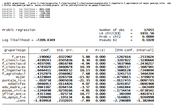 El modelo clásico de regresión no otorga la mejor determinación para el problema estudiado, por lo cual se hace necesario considerar modelos de respuesta binaria con mayor grado de sofisticación, la cual incluye estimaciones acordes a los modelos probabilísticos, particularmente al modelo probit. De acuerdo con Stock y Watson (2012), las regresiones de tipo probit son modelos de carácter no lineal diseñados específicamente para variables dependientes binarias.