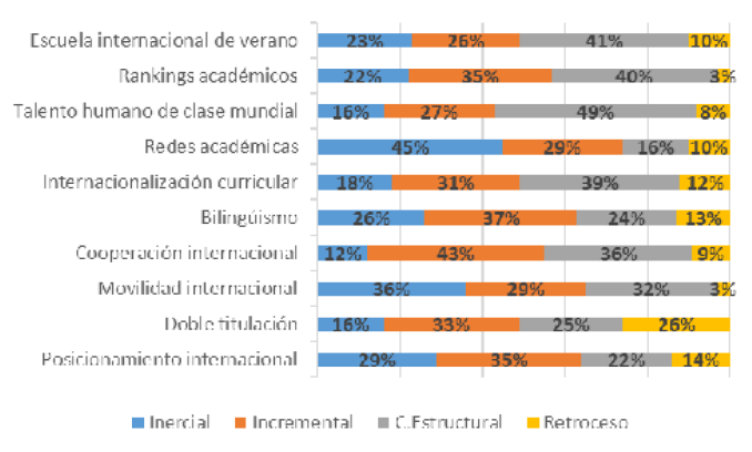En el subsistema de posicionamiento internacional (Figura 2), se destaca el escenario de cambio estructural. Las variables internacionalización del currículo, talento humano de clase mundial y visibilidad en rankings internacionales, se convierten en aspectos estratégicos para tener en cuenta en el proceso de conversión de la institución en un centro de excelencia académica de nivel internacional. En un escenario de cambio incremental, resulta necesario impulsar las dobles titulaciones y homologaciones con universidades del extranjero. Como también, consolidar los procesos de cooperación internacional y bilingüismo, para garantizar la formación de capacidades que permitan preparar la institución en sus procesos de internacionalización.