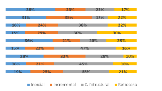 Los escenarios de futuro permiten esquematizar una determinada interpretación de la realidad y describir la transición de un sistema social desde una situación presente hacia una futura. El escenario inercial se caracteriza por mostrar lo que sucederá, si los factores clave siguen su curso tendencial. Se define por los aspectos históricos, o nuevos, que inciden en el reforzamiento de las tendencias actuales. El escenario de desarrollo incremental plantea ajustes razonables que se pueden presentar en el corto o mediano plazo, partiendo de las condiciones de competitividad existentes. El escenario de cambio estructural implica una transformación profunda y estructurada, sobre procesos de ruptura que quiebran las tendencias existentes. Finalmente, el escenario de retroceso contempla el deterioro de la situación actual por causa de factores desestabilizantes, inesperados o descontrolados (Masini & Medina, 2000).