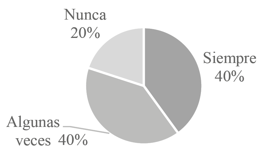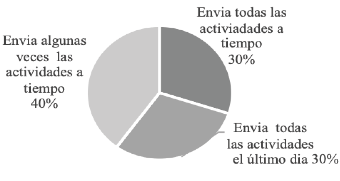 En la Figura 3 se muestran los porcentajes y variables de tiempo de realización y envío de actividades académicas, asimismo se puede evidenciar que menos de la mitad de los estudiantes afirman enviar sus actividades académicas algunas veces a tiempo, frente a ello los estudiantes sostienen que esto se debe a factores externos relacionados con las TIC y falta de tiempo por sus actividades laborales y personales. Asimismo, en un porcentaje inferior, los estudiantes sostienen enviar todas sus actividades con tiempo suficiente.