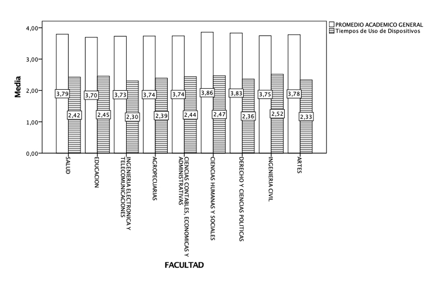 Con relación al rendimiento académico de la población en general se evidencia un promedio de 3.766 ± 0.259 de nota, y de acuerdo con el sexo se observaron diferencias, donde los hombres presentaron promedios de 3.66 ± 0.22 y las mujeres 3.86 ± 0.263 de calificación. Al hacer un análisis del rendimiento por facultad en la universidad, se aprecia en la Figura 1, que las calificaciones presentan fluctuaciones superiores por parte de la facultad de Ciencias Humanas y Sociales (x̄= 3.86), seguido de la facultad de Derecho y Ciencias Políticas (x̄ = 3.83) y las más bajas en la facultad de Educación (x̄= 3.70). De la misma manera, los tiempos de uso de los dispositivos por facultad mostraron una mayor utilización de dispositivos por parte de la facultad de ingeniería civil (x̄ = 2.52 horas) y la facultad de Ciencias Humanas y Sociales (x̄ = 2.47 horas).