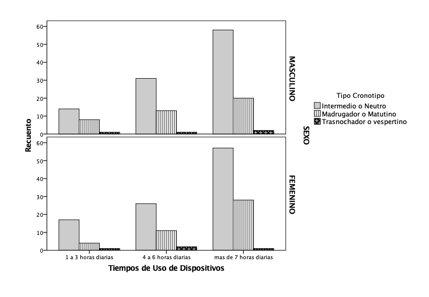 En la actualidad la tendencia al uso de dispositivos se ha incrementado y este hecho ha influido en la variedad del cronotipo de los estudiantes, y a la hora de vincularlo con los procesos académicos, es notoria su moderada relación, aspecto que debe profundizarse con la vinculación de otras variables.