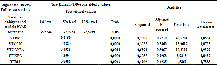 Con relación a la prueba de hipótesis conjunta de los parámetros asociados, F-statistic, son iguales a cero (excepto el intercepto). Siendo H0: β1 = β2 = β3 = βi, para un grado de libertad gl = 51–1 = 50 y un nivel de confianza del 95%, el valor calculado es F0, 05 = 4,08 el cual es menor que los valores de F de prueba. De esta manera: 40,57 para VTBM; 13,96 para VTCCN; 10,41 para VTCCNEA; 5,93 para VTINPC; y 4,59 para VTM1. Estos resultados confirman la hipótesis planteada de no presencia de raíz unitaria.