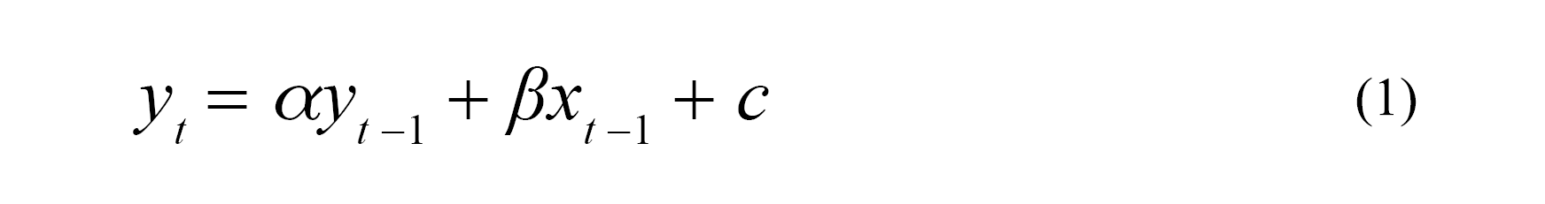 Donde, α y β son los coeficientes de las variables endógenas de la ecuación, mientras Yt es la variable endógena en el período actual. Por otra parte, Yt–1 es la misma variable endógena, pero con 1 período de rezago, Xt–1 es la variable exógena con 1 período de rezago y C es el intercepto. El modelo (1) se utilizó en la presente investigación para estimar el comportamiento VTINPC y VTCCNEA en función del saldo de las VTBM, VTCCN y VTM1 con la finalidad de encontrar las ecuaciones que más se ajusten al comportamiento de las variables endógenas.