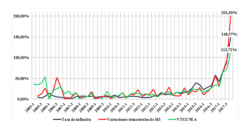 Figura 2. Variaciones trimestrales del INPC, CCNEA y M1 (período 2005-2017).