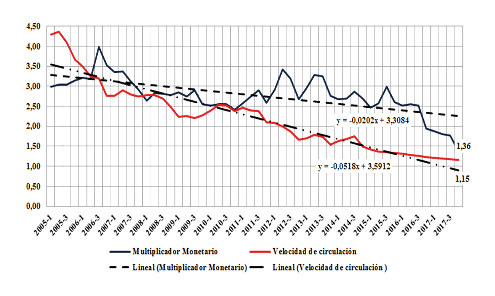 Figura 3. Multiplicador monetario y velocidad de circulación del dinero período 2005-2017