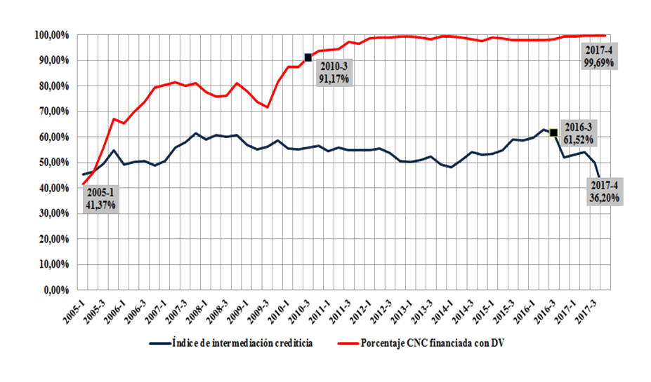 Todo lo anterior en un contexto en donde el índice de intermediación financiera (CCN/CP) se mantuvo oscilante entre el 45% y 62% desde 2005-1 hasta 2016-3, comenzando en 2016-4 con una caída abrupta hasta 2017-4 donde cerró en 36,20%, producto de la contracción del crédito antes señala anteriormente.