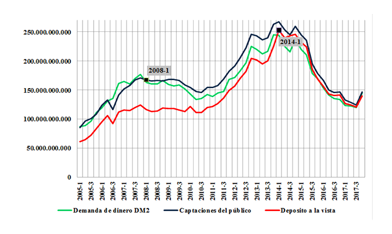 La política monetaria venezolana en el lapso considerado en este trabajo deja ver elementos diferenciados preocupantes al ser prácticamente iguales la oferta de dinero en sentido restringido M1 y en sentido amplio M2 por la inexistencia de los depósitos a plazo. Este fenómeno se acentuó después del proceso de reconversión monetaria en el año 2008 y no antes. Después de 2008, los depósitos a plazo comenzaron a ser inferiores a las captaciones del público del sistema bancario; mientras a partir de 2014-1 a raíz del inicio de la contracción progresiva del crédito hasta 2017-4 los depósitos a la vista también comienzan a ser superiores a M1 y M2.