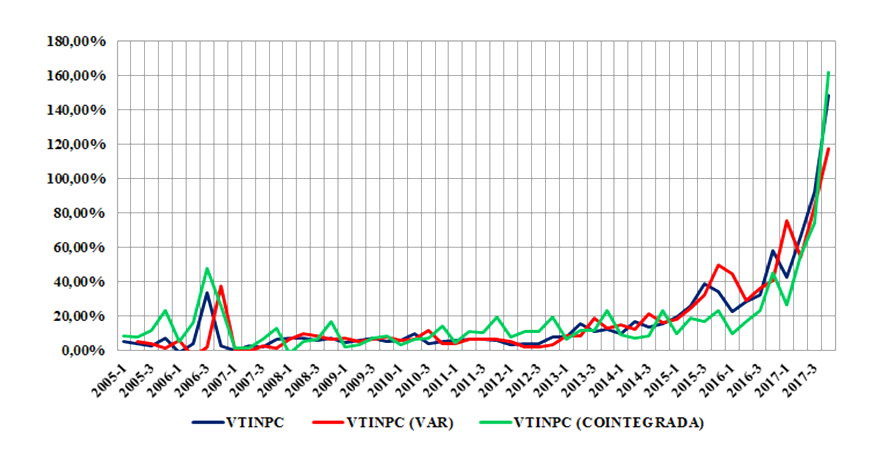 Figura 8. VTINPC, Vector autorregresivo para VTINPC y Vector de cointegración de VTINPC con VTBM y VTM1 para el período 2005-2017.