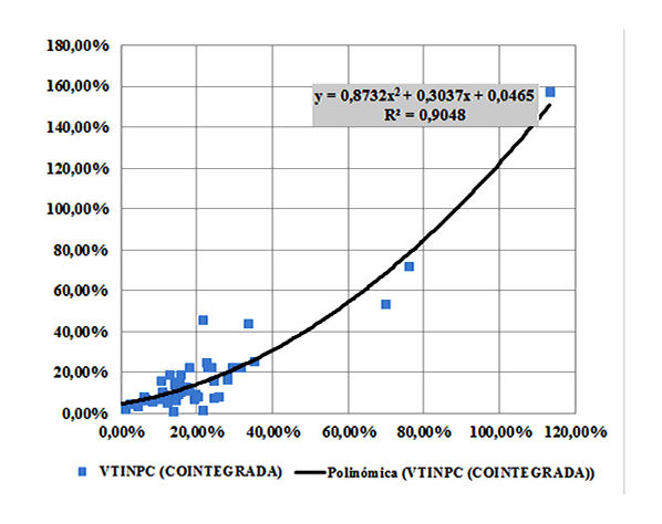 La Figura 10 muestra la función resultante del vector de cointegración de VTINPC respecto al vector de cointegración de VTCCNEA para el período 2005-2017, cuya línea de tendencia es y = 0,8732x2 + 0,3037x + 0,0465, el cual explica el 90,48% de su varianza y un coeficiente de correlación lineal de Pearson del 0,95 indicando el alto grado de asociación lineal entre el vector de cointegración de VTINPC respecto al vector de cointegración de VTCCNEA, y un coeficiente de elasticidad de 1,49 con lo cual una variación de trimestral de 1% de la cartera de créditos neta expandida artificialmente se traduce en un incremento del 1,49% del índice nacional de precios al consumidor, demostrando en este caso un componente de elasticidad.