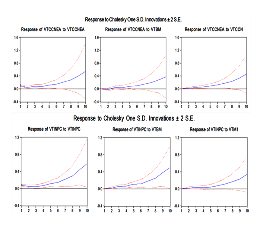 En la Figura 10 se observa la respuesta de variable endógena VTCCNEA al impulso causado por sus valores de rezago en el modelo de vector autorregresivo VTCCNEA = 0,218892128956 * VTCCNEA (-1) – 0,281145331886 * VTCCNEA (-2) – 0,152301390797 * VTBM (-1) + 0,107596222425 * VTBM (-2) + 0,53812200006 * VTCCN (-1) + 1,16816733514 * VTCCN (-2) – 0,0413497897283; a partir del período t + 1; mientras que para las variables endógenas VTCCN y VTBM la respuesta se produce para el periodo t + 2.