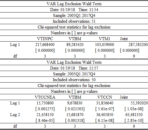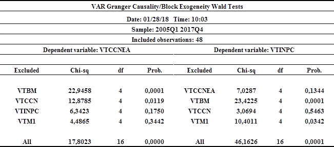 Según la prueba de LagOrderSelectionCriteria, en la cual el estadístico χ2 (Chi-Cuadrado teórico) = 9,49 para cuatro grados de libertad, demuestran, en el caso de las VTINPC, VTBM y VTM1 la existencia de una relación causal debido a que el χ2 (Chi-Cuadrado calculado) VTBM = 23,4225 > 9,49 y χ2 (Chi-Cuadrado calculado) VTM1 = 10,4011 > 9,49 (Tabla 2) y sus Prob. < 0,05; mas no así con VTCCN y VTCCNEA.