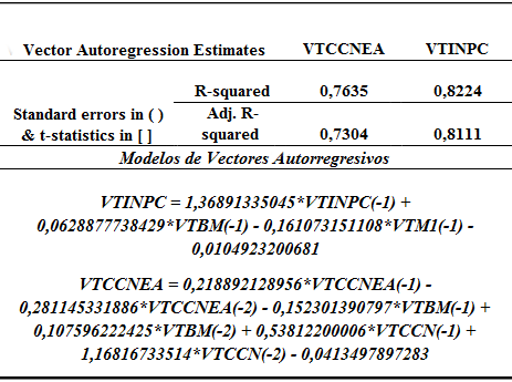 En la Tabla 5 se muestran los valores de R2 los cuales expresan el porcentaje de la varianza de las variables endógenas VTINPC y VTCCNEA, que es explicado por los modelos de vectores autorregresivos, 82,24% y 76,35% respectivamente, mientras que él R2-ajustado explica el incremento de la proporción de la varianza que es explicado por el modelo (VARE) al ingresar un nuevo rezago.