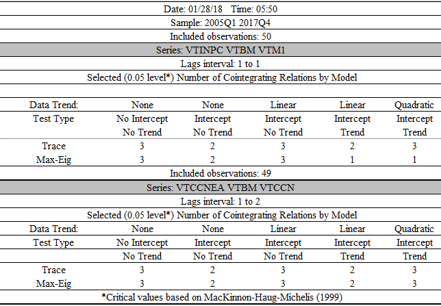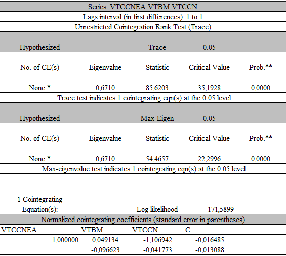 Para los efectos del presente estudio se generaron 5 opciones de relaciones de cointegración que genera el modelo tales como: sin intercepto y sin tendencia, con intercepto y sin tendencia, lineal con intercepto y sin tendencia, lineal con intercepto y tendencia y cuadrática con intercepto y tendencia. De todas las opciones, se tomaron para ambos (VARE) la relación de cointegración con vectores con intercepto y sin tendencia como se muestran a continuación en la Tabla 7 y Tabla 8, demostrando una relación a largo plazo entre las variables endógenas VTINPC, VTBM y VTM1; así como también VTCCNEA, VTBM y VTCCN.