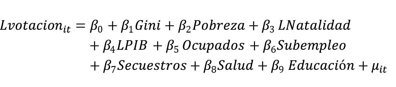 Donde es la tasa de participación electoral en las elecciones presidenciales medida en logaritmo; representa el coeficiente que mide el grado de desigualdad del país; es una medida de concentración del ingreso entre los individuos de una región en un determinado periodo, que toma valores entre 0 y 1, donde 0 indica que todos los individuos tienen el mismo ingreso y 1 indica que sólo un individuo tiene todo el ingreso; por otro lado la variable, hace relación a la pobreza monetaria, medida porcentualmente, el DANE mide el porcentaje de la población colombiana que no reciben lo suficiente de sus ingresos para satisfacer sus necesidades básicas; variable independiente que muestra la relación entre personas nacidas y la población total de cada departamento por cada mil habitantes, medida en logaritmo; es una variable que mide la producción de los bienes y servicios de la economía, se toma como base el año 2005 y se trasformó en logaritmo para mirar su variación porcentual. La variable indica el porcentaje de población que se encuentra trabajando, y la variable Subempleo indica el porcentaje de población que se encuentra subempleada por algunas de las tres razones definidas por el DANE (insuficiencia de ingresos, capacidades y horas); hace referencia al número de secuestros que hay en el país por cada 100.000 habitantes, hace relación a la privación de libertad de forma ilícita a una persona o grupo de personas a causa del conflicto armado, representando la violencia que se vive en el país; hace referencia al número de personas que están vinculadas en el Sistema General de Seguridad Social en Salud, convertida en variación porcentual; la variable medida en logaritmo indica el número de personas matriculadas que pertenecen a la educación superior, incluyendo técnicos, tecnólogos, pregrados y postgrados. El término se define como la perturbación o el efecto inobservable, en este se incluye todas las demás variables que inciden sobre la variable dependiente pero no fueron incluidas en el modelo.