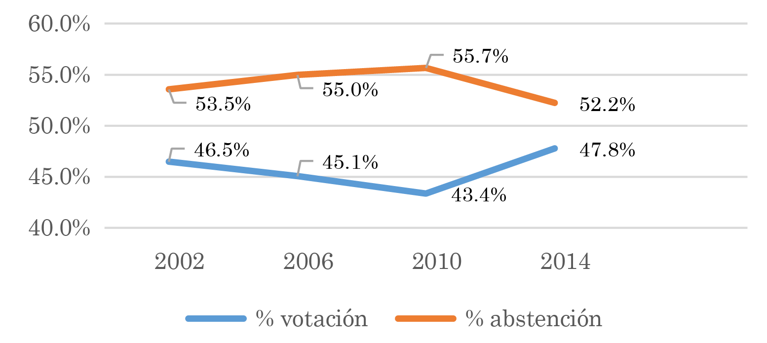 Figura 1. Porcentaje de la participación electoral y abstención para elecciones presidenciales en Colombia (2002 – 2014)