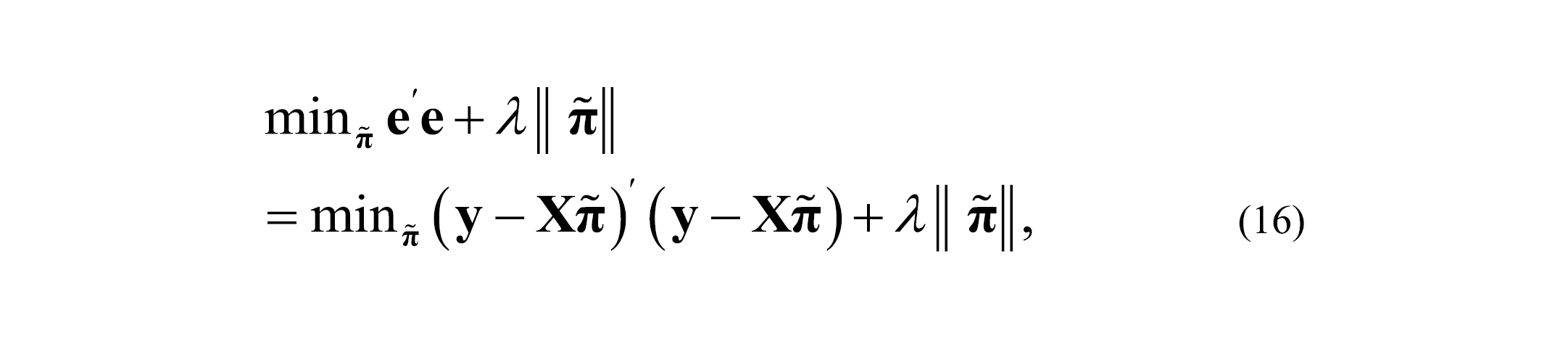 Where λ is a non-negative hyperparameter, ║•║ is the Euclidean or L2-norm defined as ║π║ = √π 21 + … + π 2m, e is a vector of estimated residuals of the linear regression, y is a vector of yt values in time, and X is the matrix of predictors made of the column vectors (1 y–1 … y–m ), where 1 is a vector of ones, and y–k is a vector of lagged values yt–1.