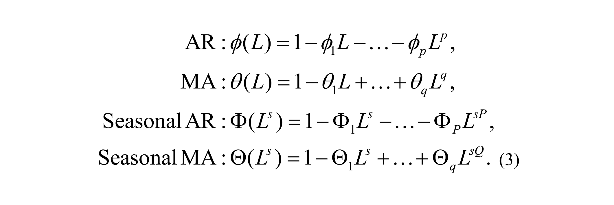Is the lag operator and the AR, MA, seasonal AR and seasonal MA polynomials are defined as (3):