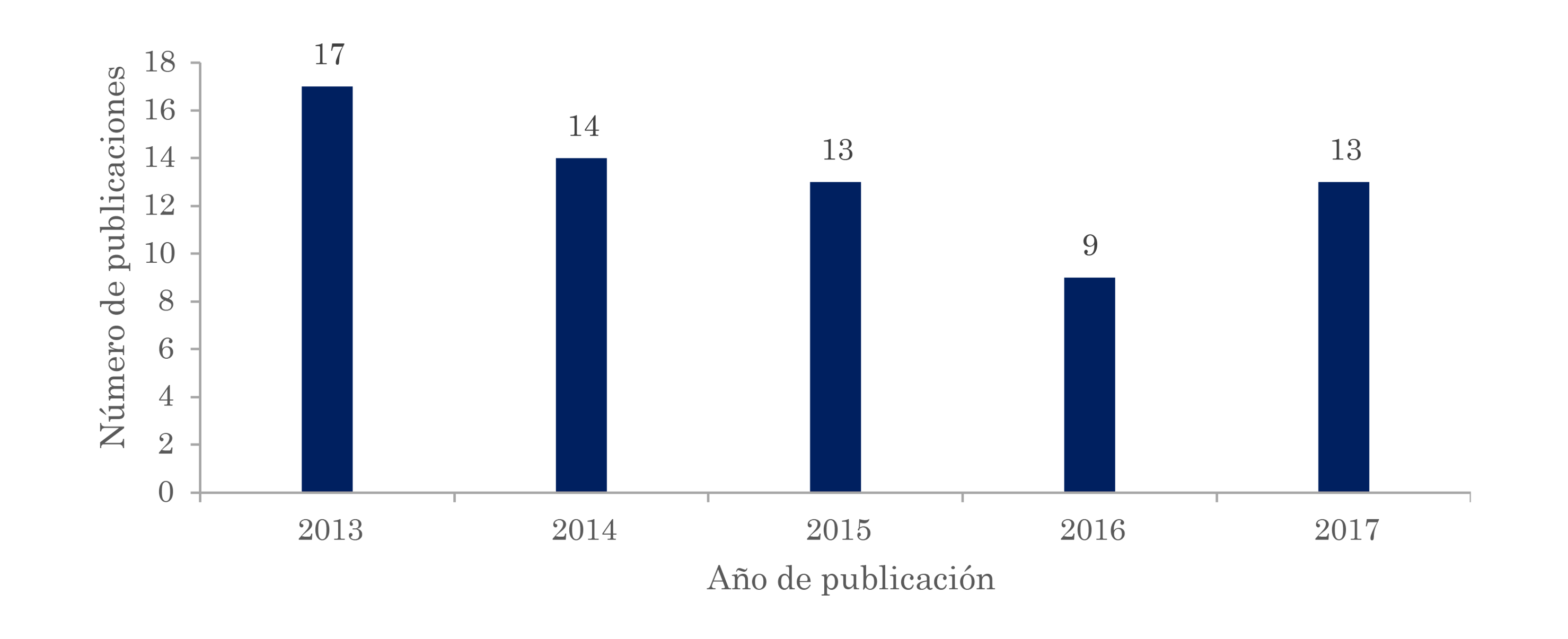 Después de aplicar los criterios de inclusión y exclusión señalados anteriormente, el resultado obtenidos fue de 124 documentos. En este orden, para seleccionar las publicaciones científicas de mayor relevancia con el estudio y facilitar el análisis de la información documental, se optó por limitar el análisis a las publicaciones realizadas en el periodo comprendido entre los años 2013 y 2017. De esta forma, se logró la identificación de un total de 68 publicaciones, procediendo a la descarga de los documentos en formato digital, y excluyendo dos publicaciones al no lograr ubicarlas en las páginas web de sus respectivas revistas científicas. El resultado final fue de 66 publicaciones relevantes identificadas, las cuales representan el 15,56% del conjunto de 424 publicaciones identificadas inicialmente como potencialmente relevantes. Se debe señalar como, a pesar de que no existe un consenso generalmente aceptado, el número de estudios finalmente incluidos en revisiones de literatura suelen representar entre el 10% y el 40% del número de estudios del grupo potencial (Briner & Walshe, 2014).