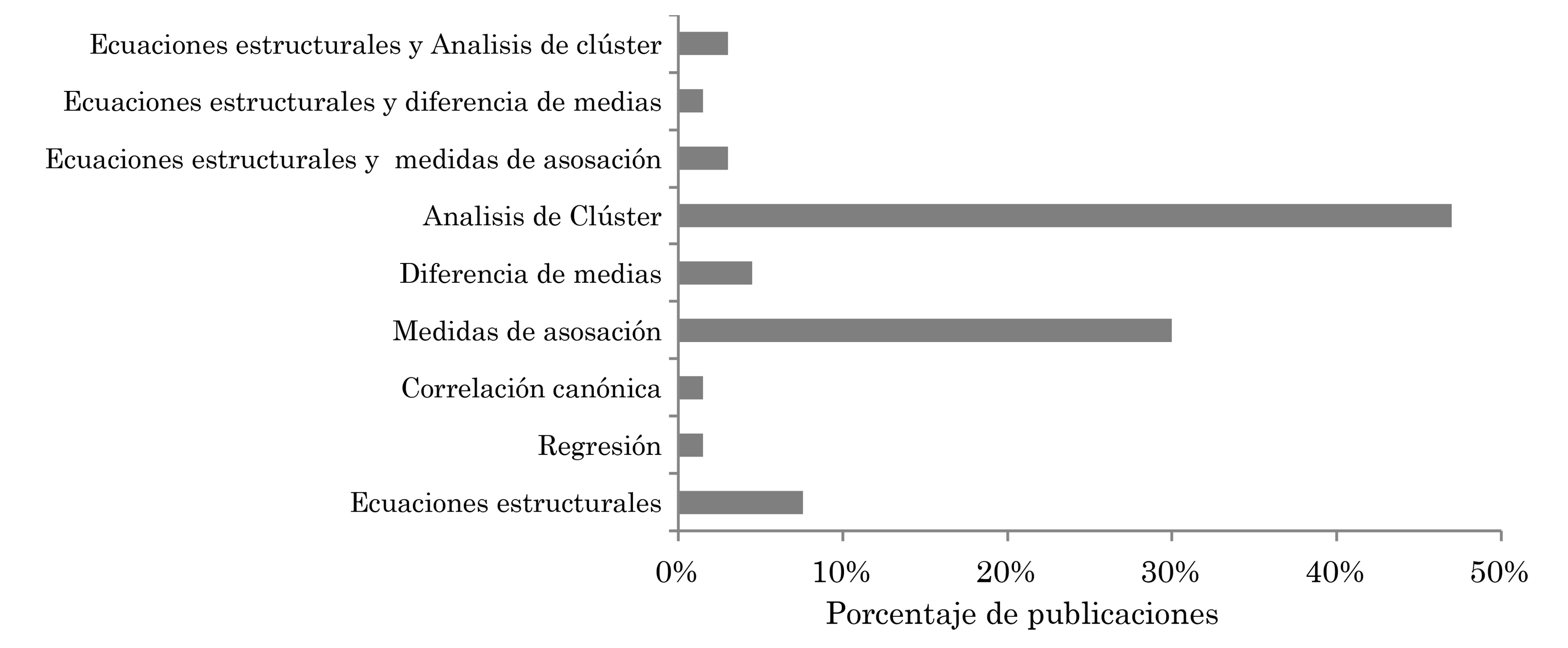 Los métodos para analizar la información de los documentos revisados son varios, el de más alto rango es “análisis de clúster” donde se encuentra 31 documentos que representan al 47,0%; seguido por “medidas de asociación” con 20 documentos correspondientes al 30,3%; “ecuaciones estructurales” con 5 documentos representando un 7,6%, “regresión” y “correlación canónica” con 1 documento cada uno, con el 1,5% del total; y dejando por ultimo los documentos que emplearon más de un tipo de análisis de información, como “ecuaciones estructurales y medidas de asociación” y “ecuaciones estructurales y análisis de clúster” con 2 documentos cada uno, representando el 3,0% del total de los documentos revisados (Figura 3).