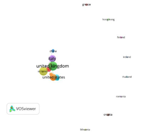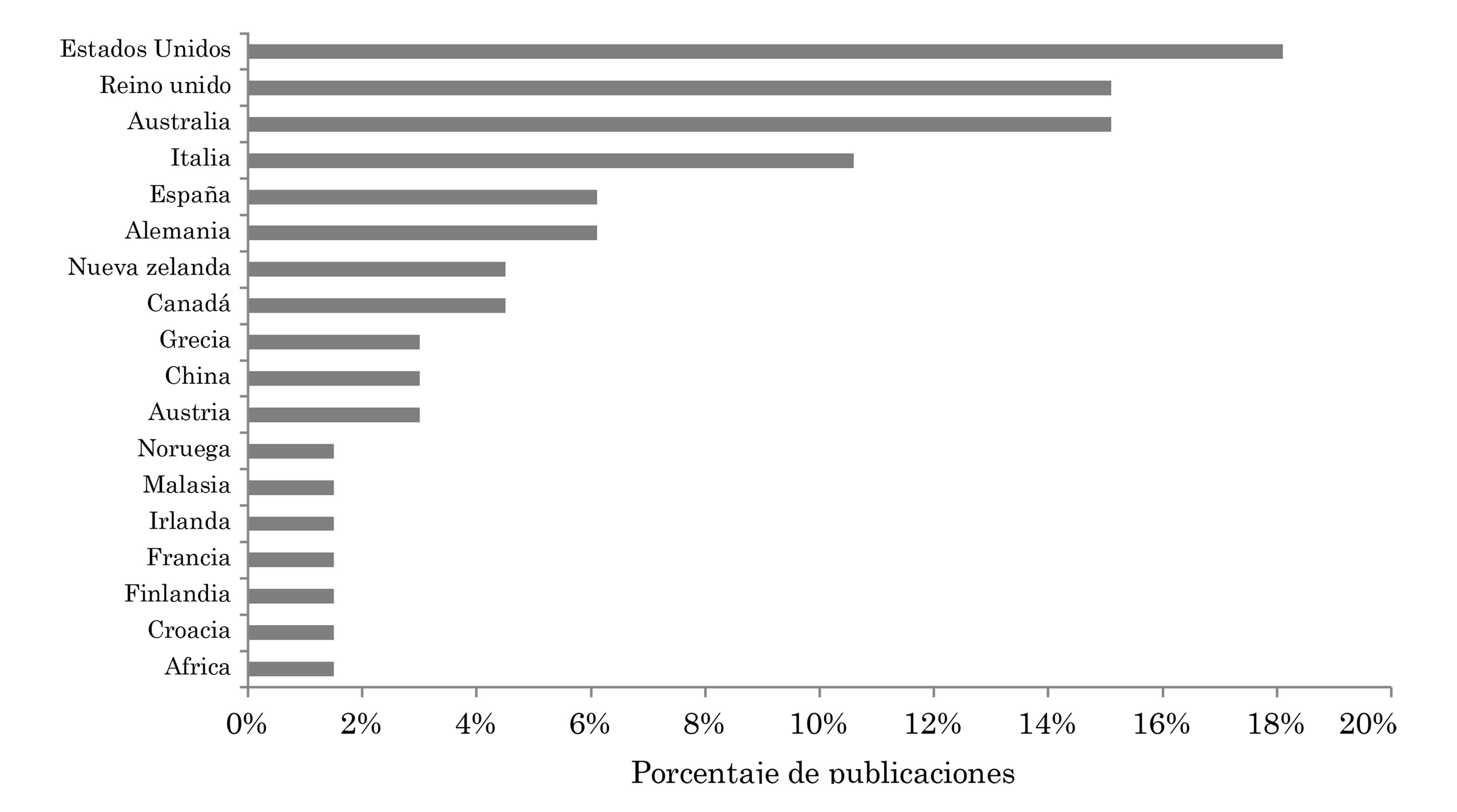 Dentro de la revisión documental realizada, como se observa en la Figura 4, se identificaron un total de 18 países con publicaciones científicas, cabe destacar, a Estados Unidos posicionado en primer lugar, al ser el país con mayor concentración de documentos publicados, con 12 documentos que representan un 18% del total de los documentos. Por otro lado, Australia y Reino Unido se posicionan con 10 documentos cada uno, representando un 15%; e Italia con 7 documentos que corresponden al 10%. Resaltando con esto a los países con más relevancia en la producción científica relacionada con este tema.