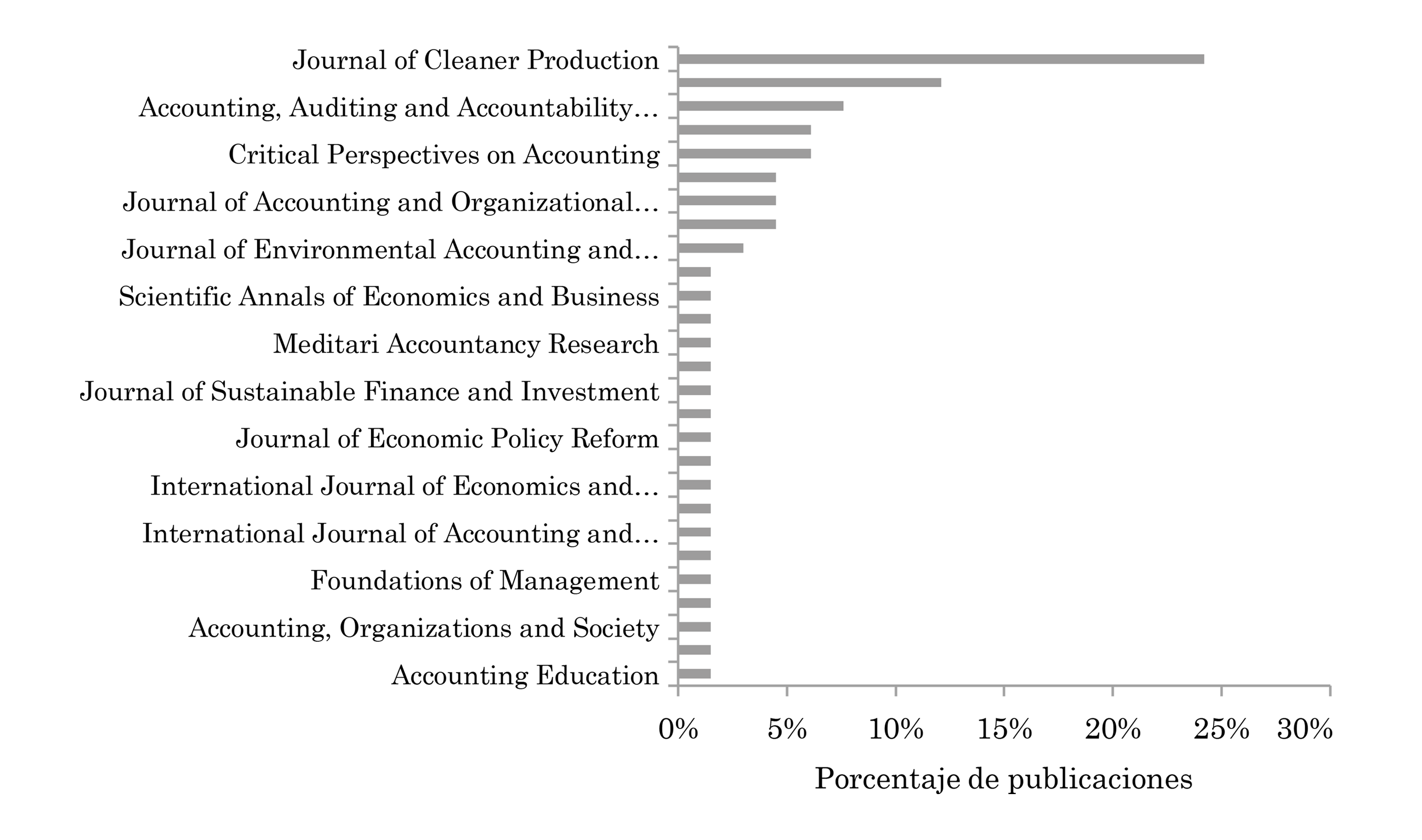 Figura 5. Distribución porcentual de las principales revistas con producción científica relacionada con contabilidad ambiental y sostenibilidad por número de publicaciones, 2013-2017.