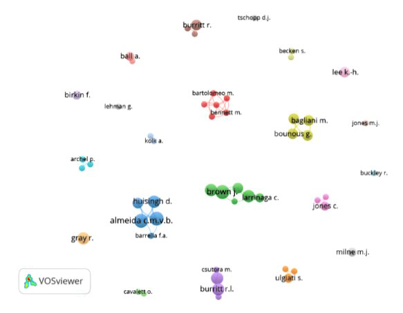 Por otra parte, con base en el análisis de las redes de colaboración científica a nivel mundial, se destaca un clúster de autores que registra la mayor cantidad de publicaciones en coautoría son: Almeida, C. M. V. B.; Barrella, F. A.; Bonilla, S. H.; Gianneti, B. F. y Huisingh, D. Mientras, en el caso de los países, se destaca por registrar el mayor número de publicaciones en el campo de estudio, el clúster de autores con origen en Australia, España y Reino Unido. En este sentido, se destaca como algunos de los autores del principal clúster de colaboración científica fueron identificados como autores de los documentos con mayor número de citaciones en el periodo bajo observación, los cuales fueron en su orden: I) Brown & Dillard (2014) con 68 citaciones; II) Bebbington & Larrinaga (2014) con 2 citaciones; III) Almeida, Bonilla, Giannetti, & Huisingh (2013) con 3 citaciones; y IV) Almeida, Bonilla, Giannetti, & Huisingh (2015) con 3 citaciones.
