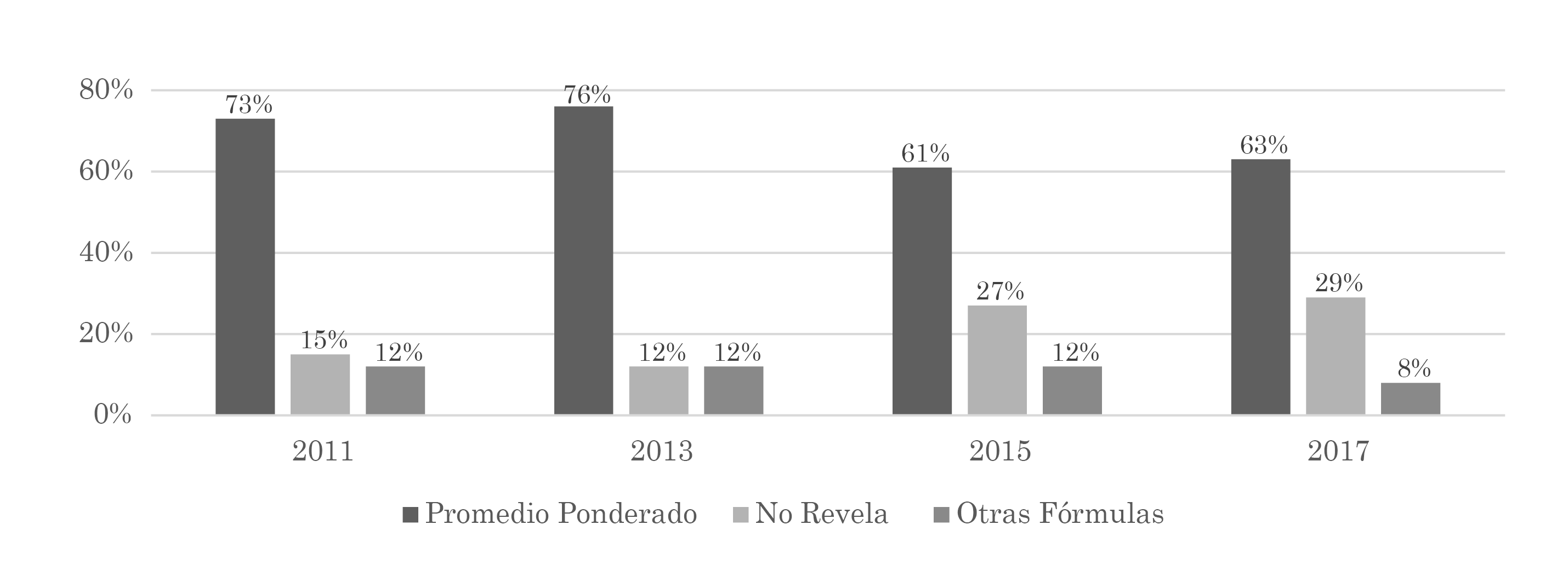 Igualmente, se puede apreciar que la fórmula de cálculo de costos de los inventarios más utilizada por las empresas colombianas cotizantes no financieras es el promedio ponderado, en los ejercicios previos a la convergencia con los IFRS la divulgación de su uso llegó al 76%, posteriormente bajo los nuevos estándares disminuyó a niveles del 61%. Sin embargo, no puede afirmarse de manera contundente que este cambio en el nivel de las revelaciones implique un menor empleo de este método, pero si sugiere una pérdida de datos para adelantar comparaciones entre empresas, lo que si puede afectar la relevancia de las cifras contables en periodos cortos de tiempo.