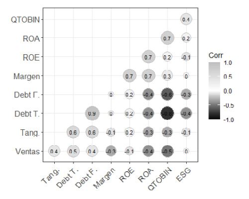 La Tabla 2 contiene las variables utilizadas en este estudio. Como variables dependientes se tienen: la Rentabilidad del Activo (ROA), la Rentabilidad del Patrimonio (ROE) y los niveles de apalancamiento de las firmas (total y financiero). La variable independiente de interés es la calidad de las practicas ESG, aproximada mediante el índice ESG de Bloomberg. En último lugar, se incluyeron tres variables de control: el logaritmo de las ventas totales, el margen neto de utilidad (en porcentaje) y la proporción de tangibilidad de los activos (en porcentaje).