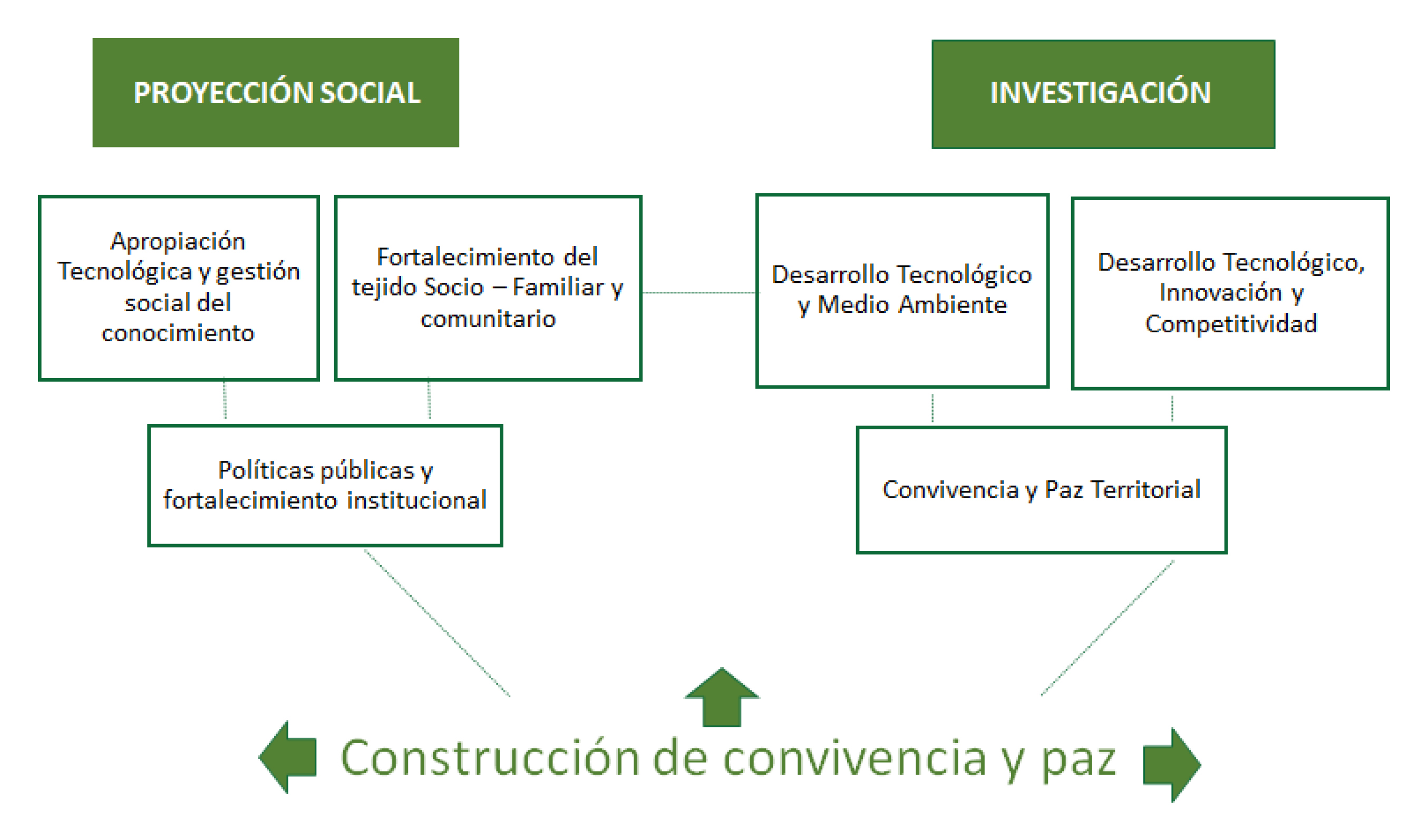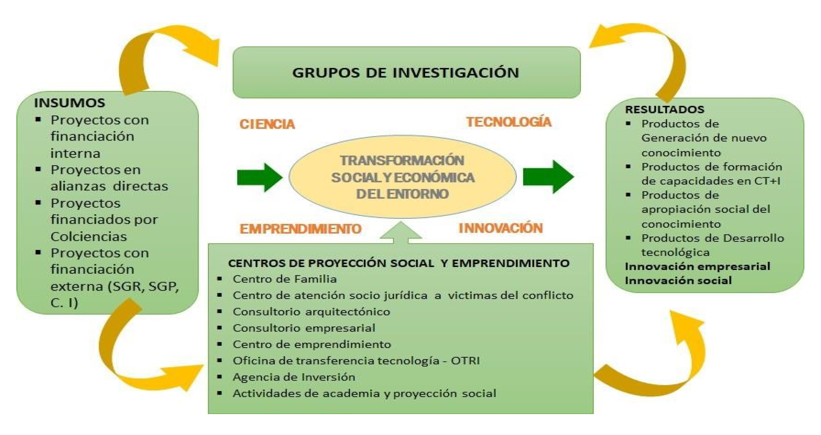 Entre estos proyectos se encuentran los financiados por el Ministerio de Ciencia Tecnología e Innovación de Colombia, también conocido como Minciencias, y los proyectos de financiación externa (Sistema General de Regalías-SGR, Sistema General de Participaciones-SGP, C.I.), que se gestan desde los diferentes Grupos de Investigación y que se estructuran a partir el modelo de ciencia, tecnología e innovación-CTeI de la institución, direccionadas por el Centro de Emprendimiento, la Oficina de Transferencia Tecnológica-OTRI, la Agencia de Inversión y los Centros de Proyección Social (Ministerio de Educación Nacional-MEN, 2019).