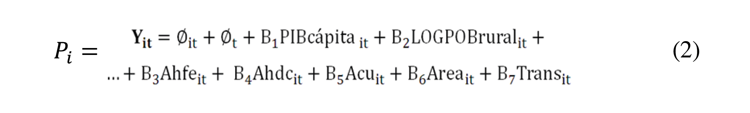 In the first model, two regressions are performed which are panel data with fixed and random effects, then the Hausman test is applied. The test yields a statistic of –13.33, that is, there is a flaw in the data that causes the asymptotic assumption of the test not to be met. Therefore, it was decided to replace the population variable by its logarithm. Transforming the new equation (2):