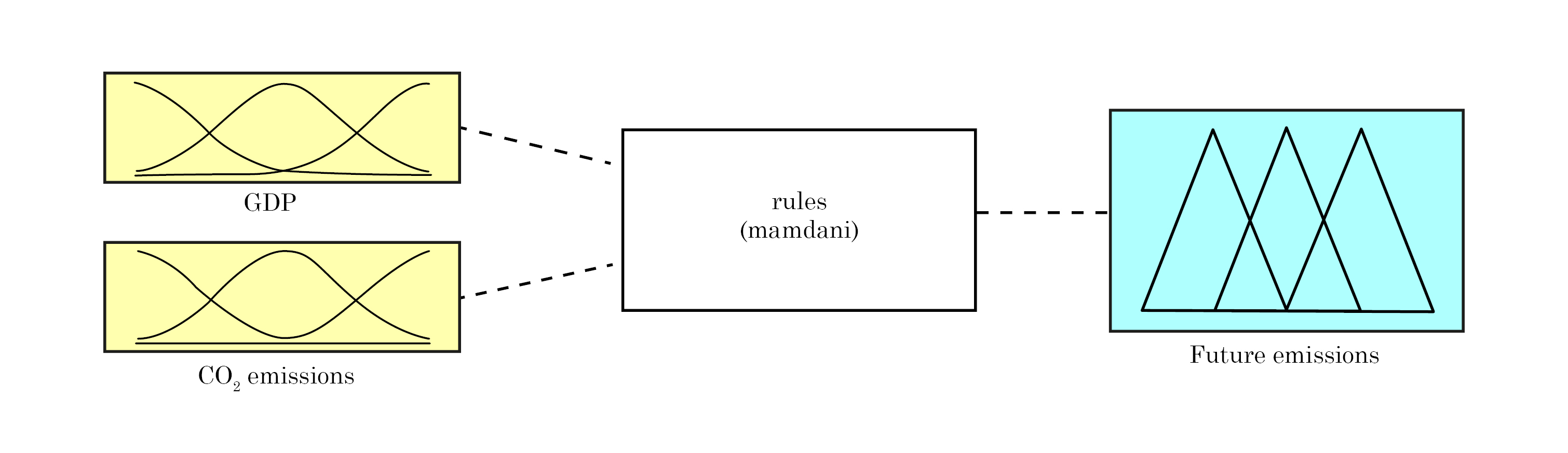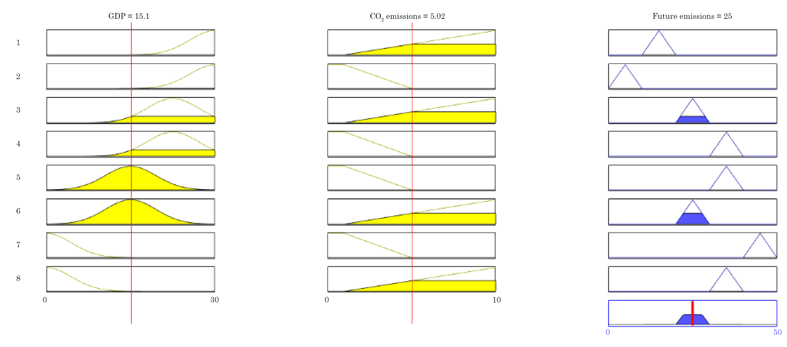 Input data of GDP per capita and CO2 emissions per capita are taken and the degree of membership in the fuzzy sets is determined, constructing the model in Figure 1. The conversion of these input data to the linguistic values is done by the degrees of similarity of the data to the linguistic variables.