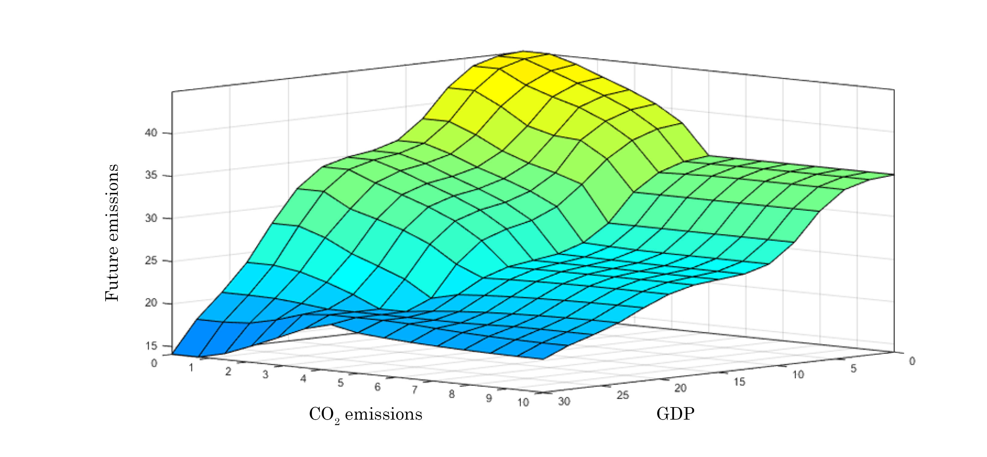 In this sense, the foundation taken to develop fuzzy logic is based on the use of mathematical models to represent subjective notions (Martínez, 2007; Almache, 2013; Vanegas, Botero and Restrepo, 2014), such as, for example, the knowledge of what will happen in the future with respect to CO2 emissions, therefore this research emphasizes CAK analysis with the theory of fuzzy sets, which through fuzzy functions allows modeling the linguistic variables of future CO2 emissions as a consequence of the model input variables: CO2 emissions and GDP per capita using software Matlab (version 9.12), with the Fuzzy Logic Toolbox-FLT tool, to develop Mamdani-type fuzzy inferences, which allow obtaining the parameters that characterize the nonlinear (non-deterministic) future of CO2 emissions.