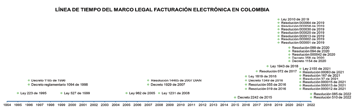 La facturación electrónica es “la evolución de la factura tradicional, para efectos legales tiene la misma validez que el papel, sin embargo, se genera, valida, expide, recibe, rechaza y conserva electrónicamente, lo que representa mayores ventajas. Tributariamente es un soporte de transacciones de venta de bienes y/o servicios” (DIAN, 2022). En Colombia, las normas definidas por el gobierno para su implementación han ido desde el año 1995 con la Ley 223 de 1995 y se sigue regulando hasta el año 2022. El Gráfico 1 muestra la evolución que ha tenido el marco legal de la FE en Colombia.