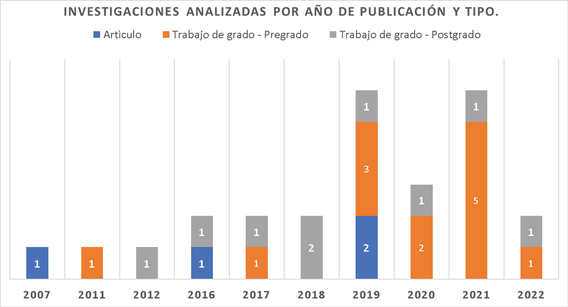Gráfico 2. Investigaciones analizadas por año de publicación y tipo.
