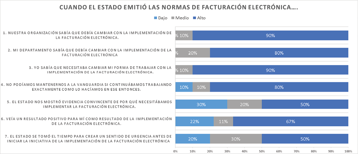 The management of technological changes poses the problem that companies do not appropriate the benefits of technology due to its dynamics, the absence of technical capabilities of the companies, and the absence of knowledge absorption capabilities, which means that methodological processes are required for the management of this type of change. The objective of this research is to offer recommendations for change management to the State to achieve a quick and effective transition to the use of technological tools. To this end, a bibliographic review of the implementation of electronic invoicing (EF) in Colombia was carried out. A survey was designed based on change management tools, reviewed by a group of experts, and applied. The results showed that there are weaknesses in the dimensions of communication and enabling action. There is agreement between the authors who have written about the implementation of EF and the results of the survey. It is concluded that change management tools are a great help for organizations to adapt more quickly to outgoing regulations, especially those involving technological change.
