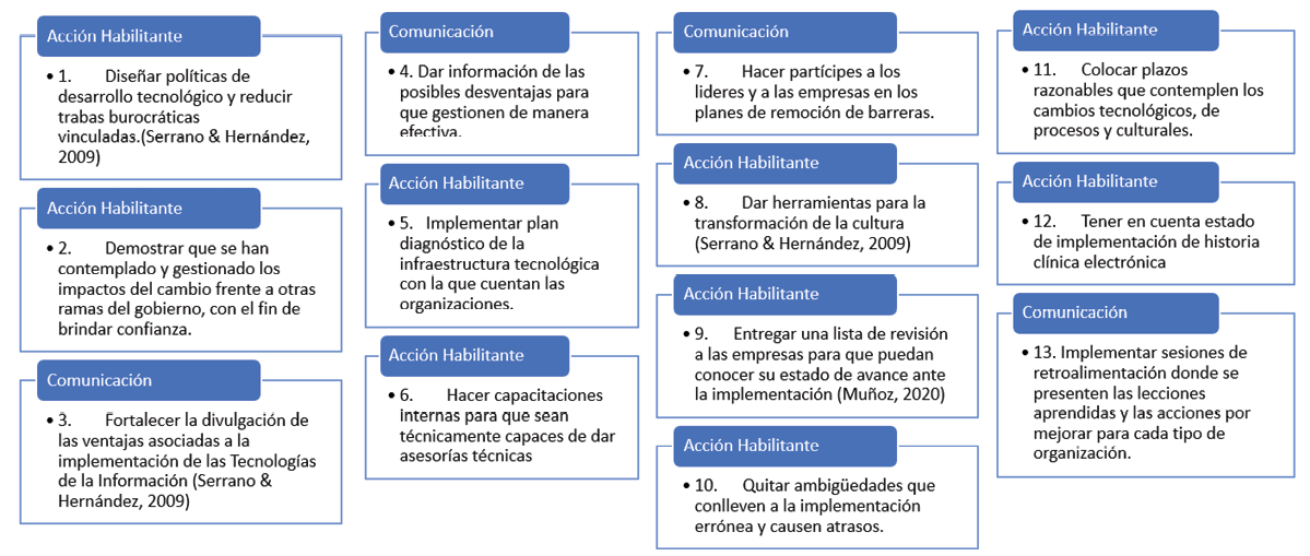 Teniendo en cuenta que en la discusión de este artículo se identifica que las principales oportunidades de mejora se relacionan con las dimensiones de comunicación y acción habilitante, se plantean 13 estrategias en el Gráfico 8 que podrían implementarse de manera articulada para aumentar la efectividad de la gestión del cambio. Se seleccionaron de la literatura las recomendaciones más pertinentes y se procedió a plantear otras alternativas adicionales por parte de los autores de este estudio. Este enfoque combinado ha permitido abordar de manera integral los desafíos identificados.