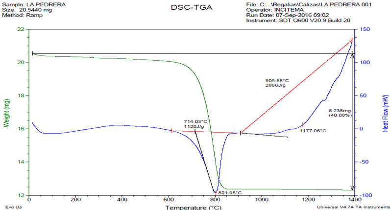 La Fig. 7 muestra un único cambio notorio observable después de la reacción, el cual es un pico correspondiente a andradita, mineral del grupo de silicatos de hierro y calcio de una típica forma isométrica en sus cristales.